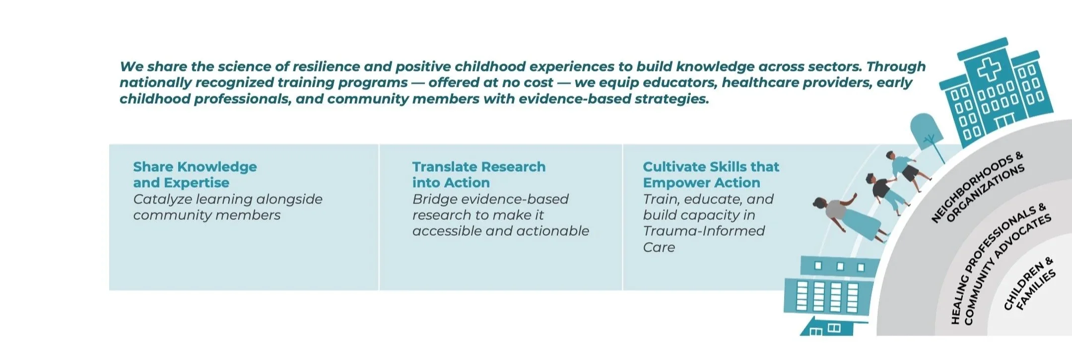 Our nationally recognized training programs — including StrongResilientYouth.org equip professionals across sectors with evidence-based strategies for recognizing adversity, building protective factors, and creating trauma-informed environments. Trainings are offered at no cost to reduce barriers.